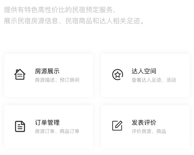 PC+公众号+小程序+APP,快速为客户搭建民宿酒店的在线业务场景。